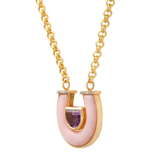 14K YG Jumbo Amethyst, Pink Opal and Diamond Horseshoe Necklace