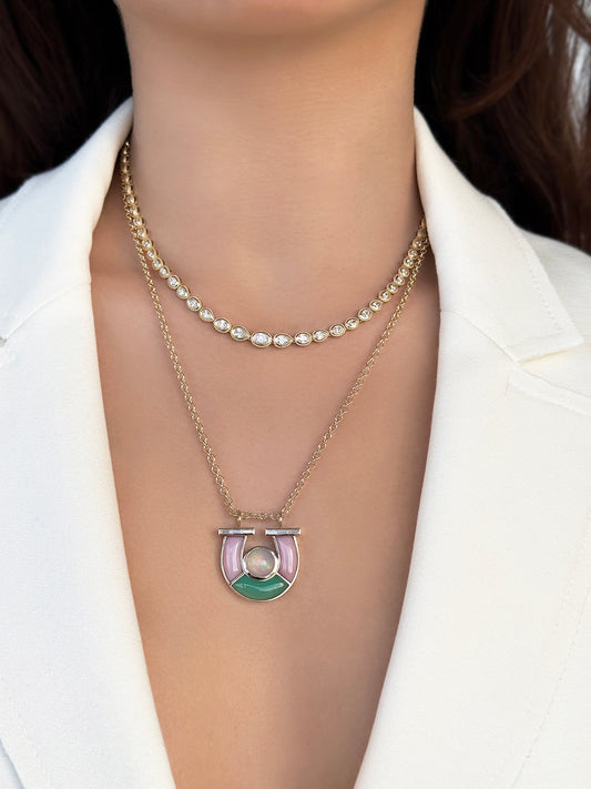 14K YG Opal, Chrysoprase, Pink Opal and Baguette Diamond Horseshoe Necklace