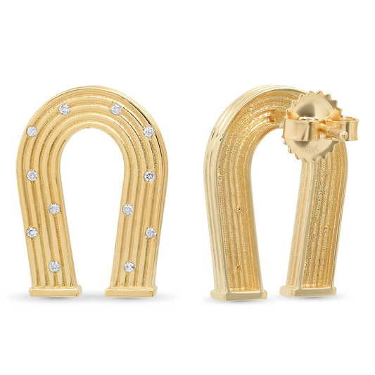 14K Yellow Gold and Diamond Reeded Horseshoe Earrings