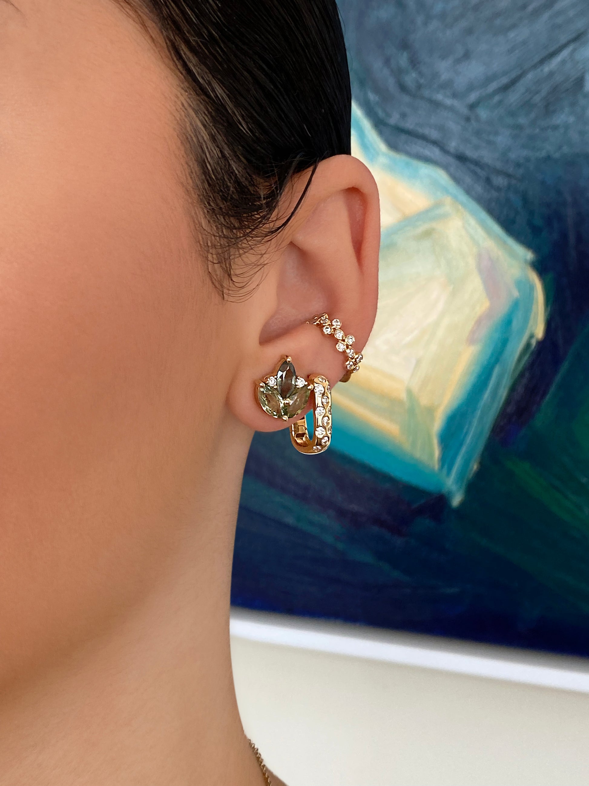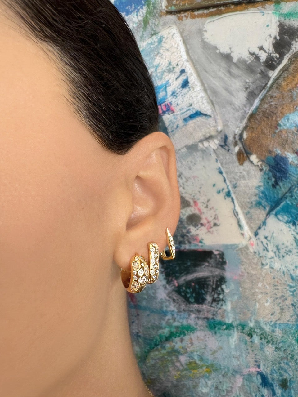 Everyday glamour found with the gorgeous Mave Diamond huggies. They don .55 tc gypsy set diamonds and are light weight and dazzling. Diamonds are SI1 and G color. Available in White gold by request.