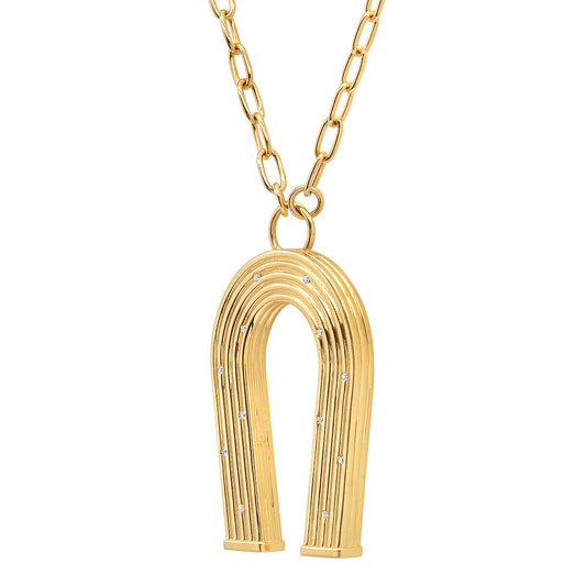 14K Yellow Gold and Diamond Reeded Horseshoe Necklace