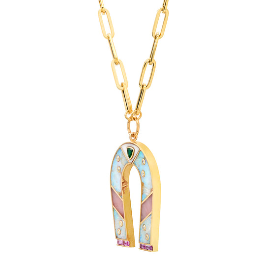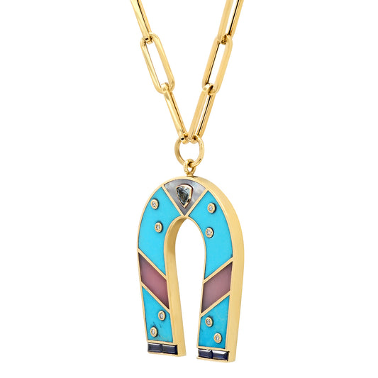 14K Yellow Gold Turquoise and Pink Opal Inlay Horseshoe Necklace