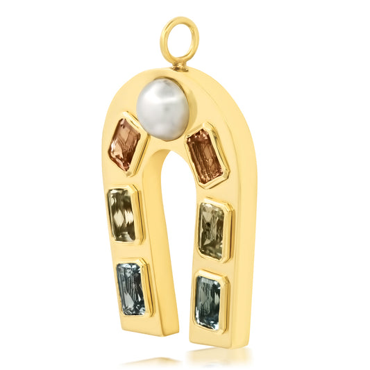 14K Yellow Gold Pearl, Morganite, Green Amethyst and Aquamarine Horseshoe Charm