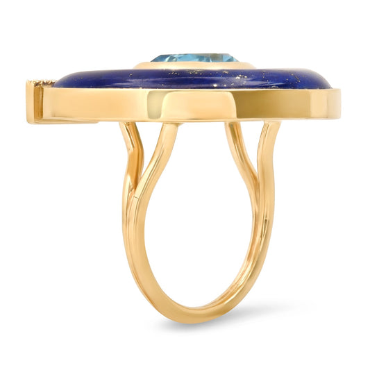 14K YG Jumbo Topaz, Lapis and Diamond Horseshoe Ring