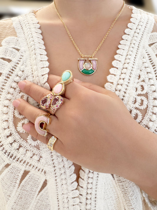 14K YG Garnet, Pink Opal and Diamond Horseshoe Ring