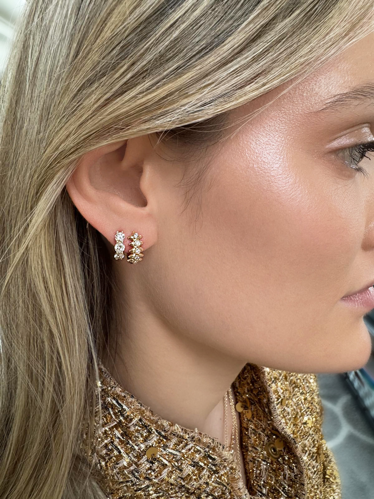 Gorgeous and classic, the Emma Diamond huggies are heirloom quality. They boast 1.20 total carats of natural, white round Diamonds. G color and VS2 clarity. Perfect on their own or layered with other Diamond huggies.