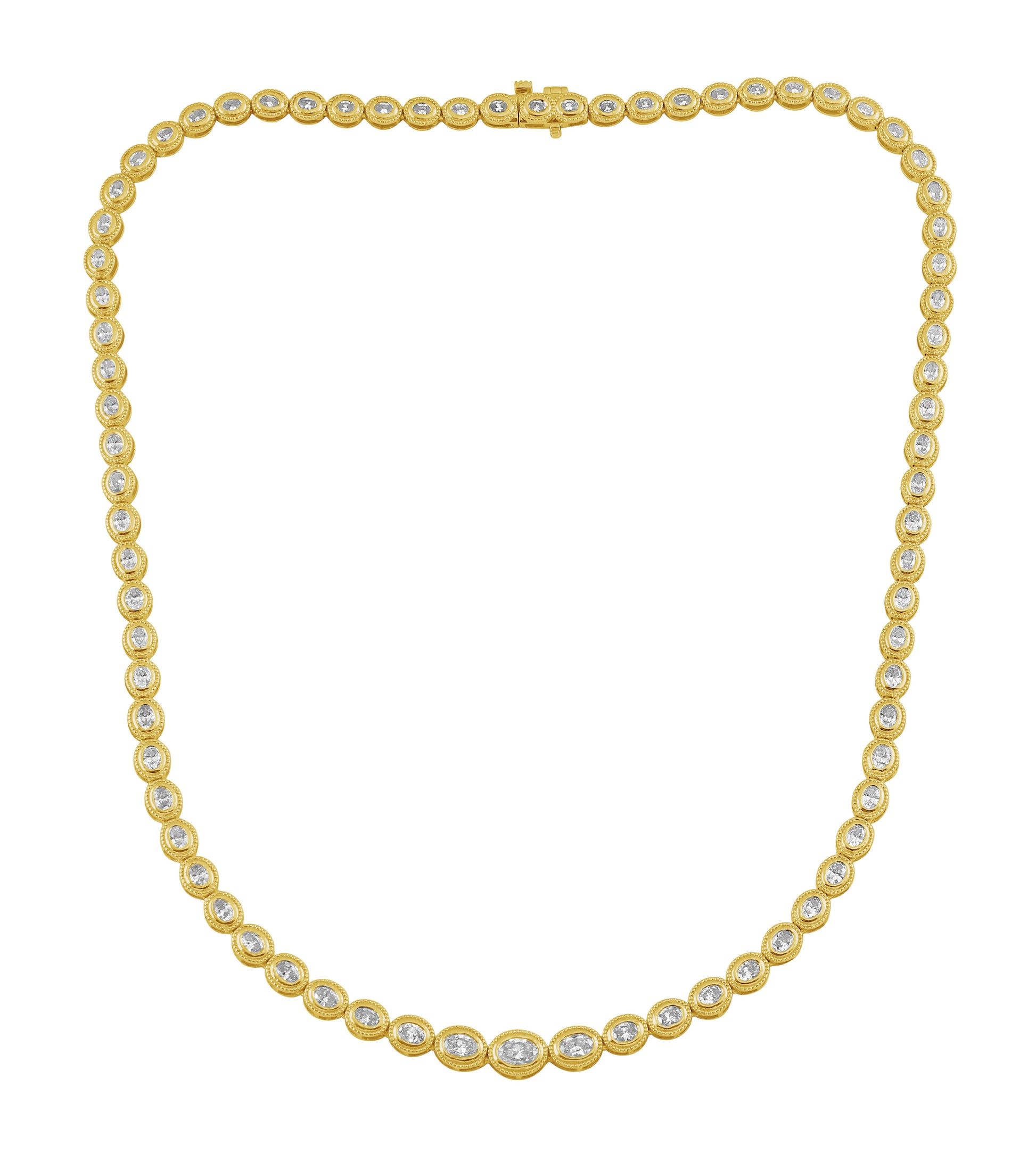 We put the WOW in tennis necklaces. Our beautiful Maven Diamond Tennis necklace boasts 6 carats of Oval cut Diamonds. Set in 22 grams of silky gold, and the most beautiful beaded bezel detail. Total length is 16", and Diamonds are G color and VS1 clarity.