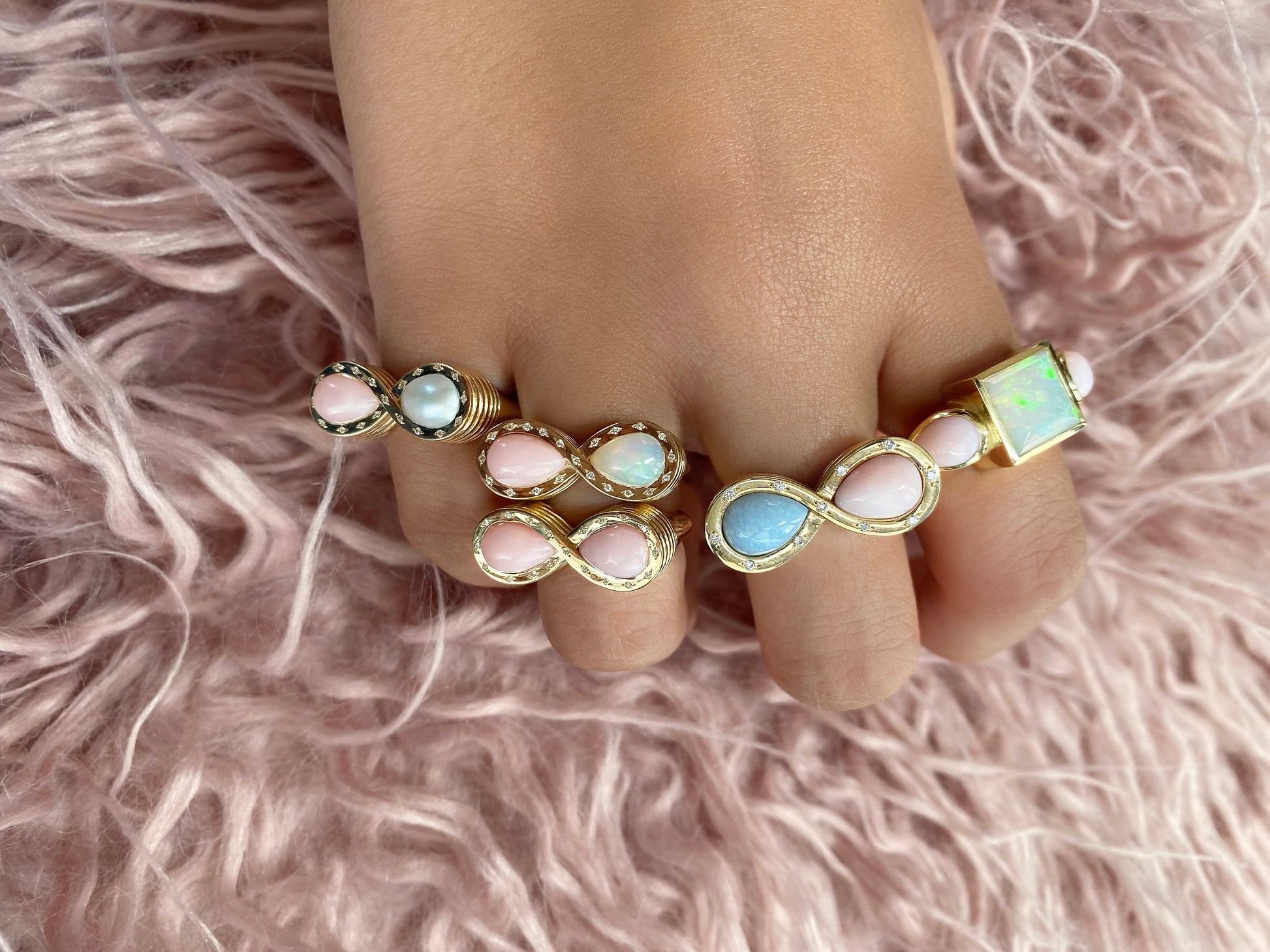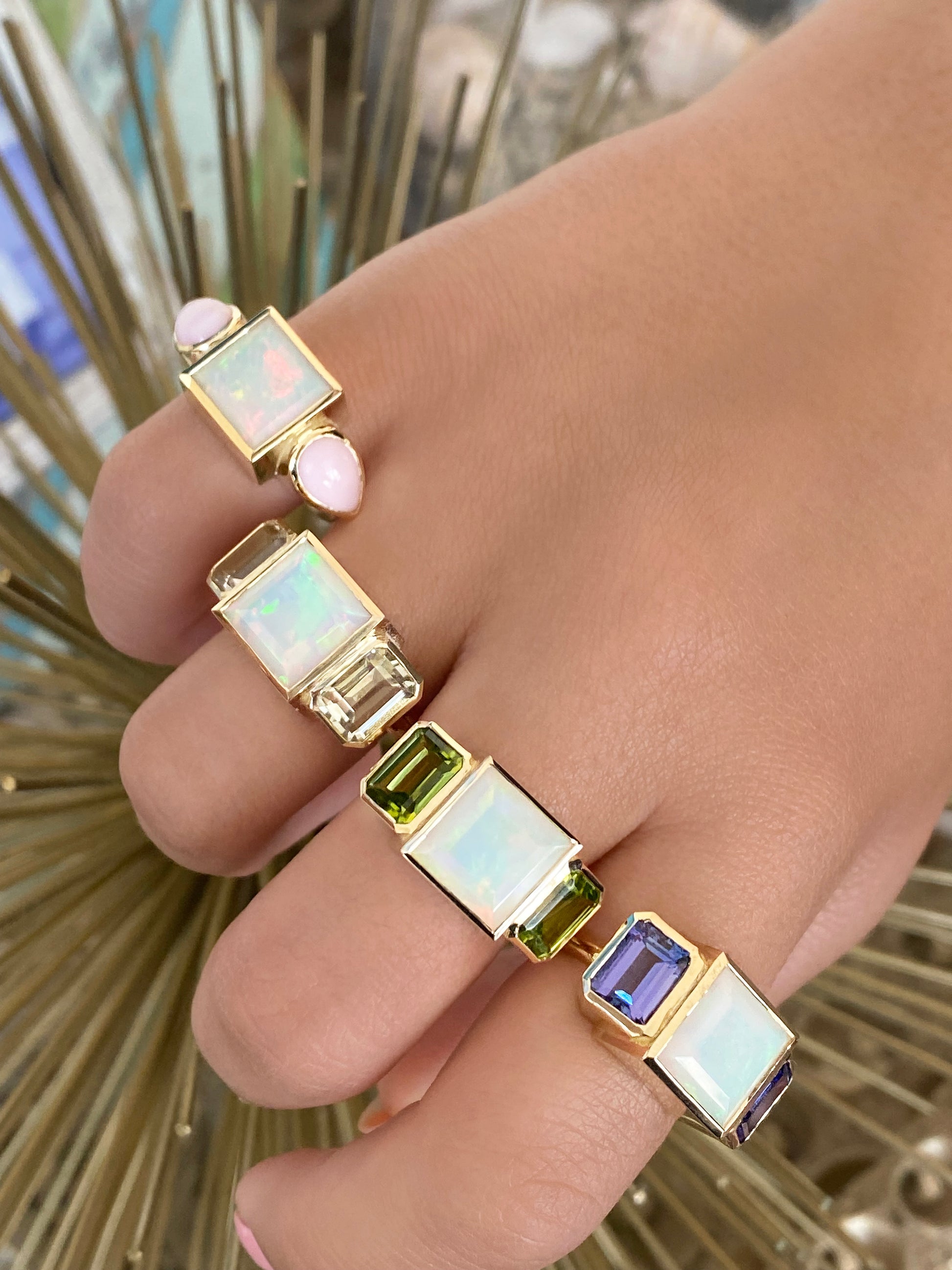 Our new gorgeous Trilogy ring, is our answer to the everyday cocktail ring. Geometric by design and perfect for every day, every occasion and with any outfit. She boasts 3 carats of mesmerizing Ethiopian Opal, flanked by two pear shaped Pink Opal cabochons.