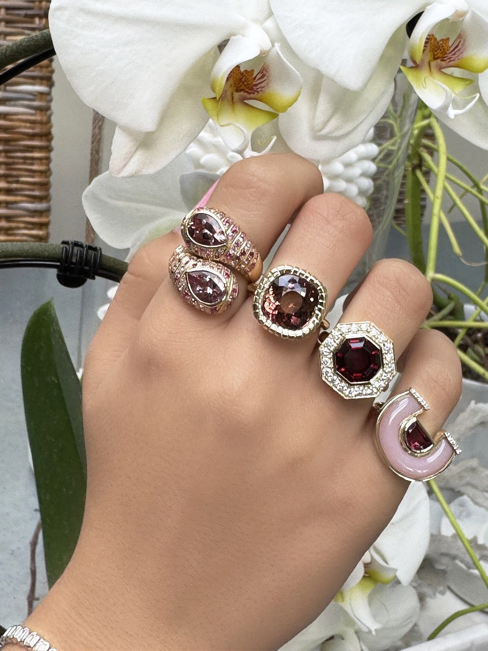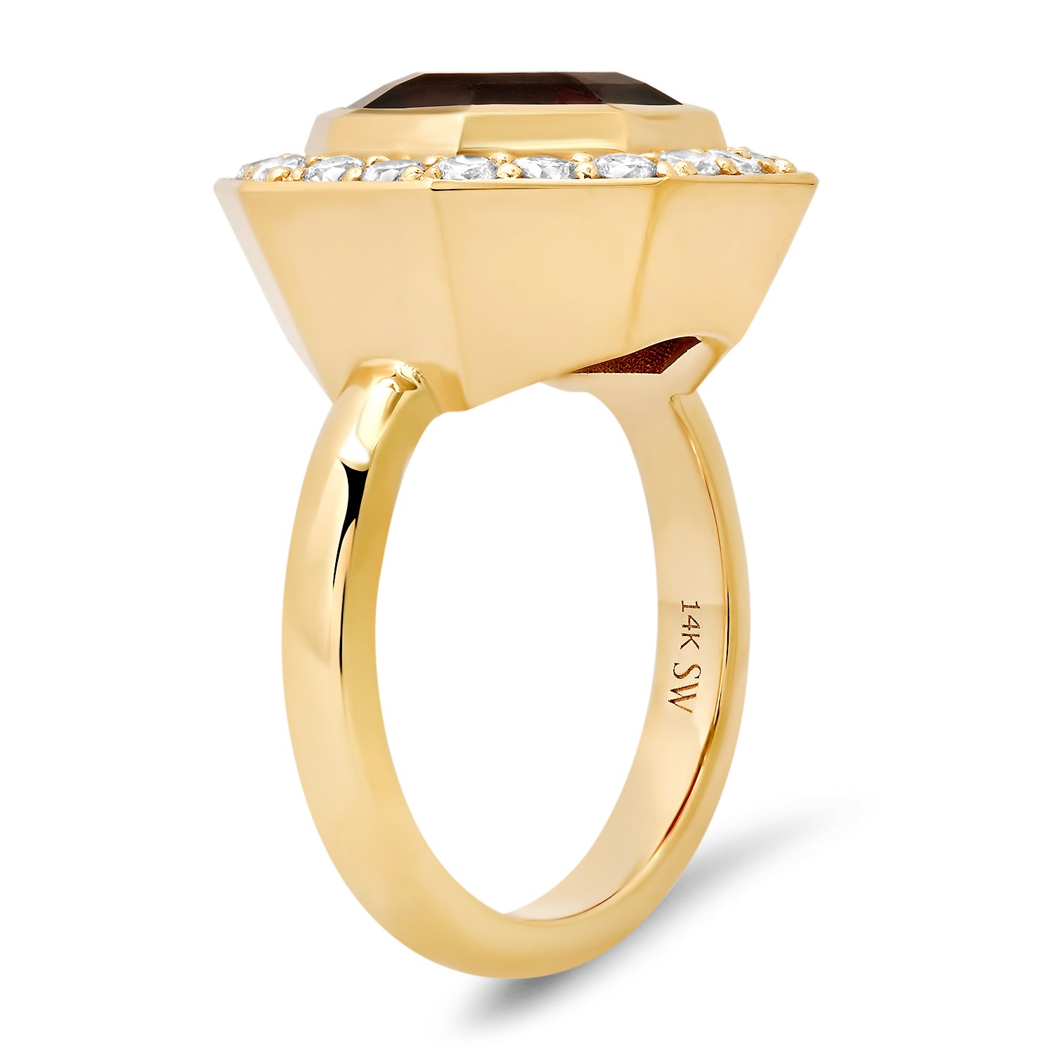 A stunning new addition to our Bia ring line up. She boasts 10 carats of deep Red Garnet Hexagon, nestled in .80 tc Diamonds. She is sculptural and bold, yet feminine and elegant, and loves to be the center of attention.