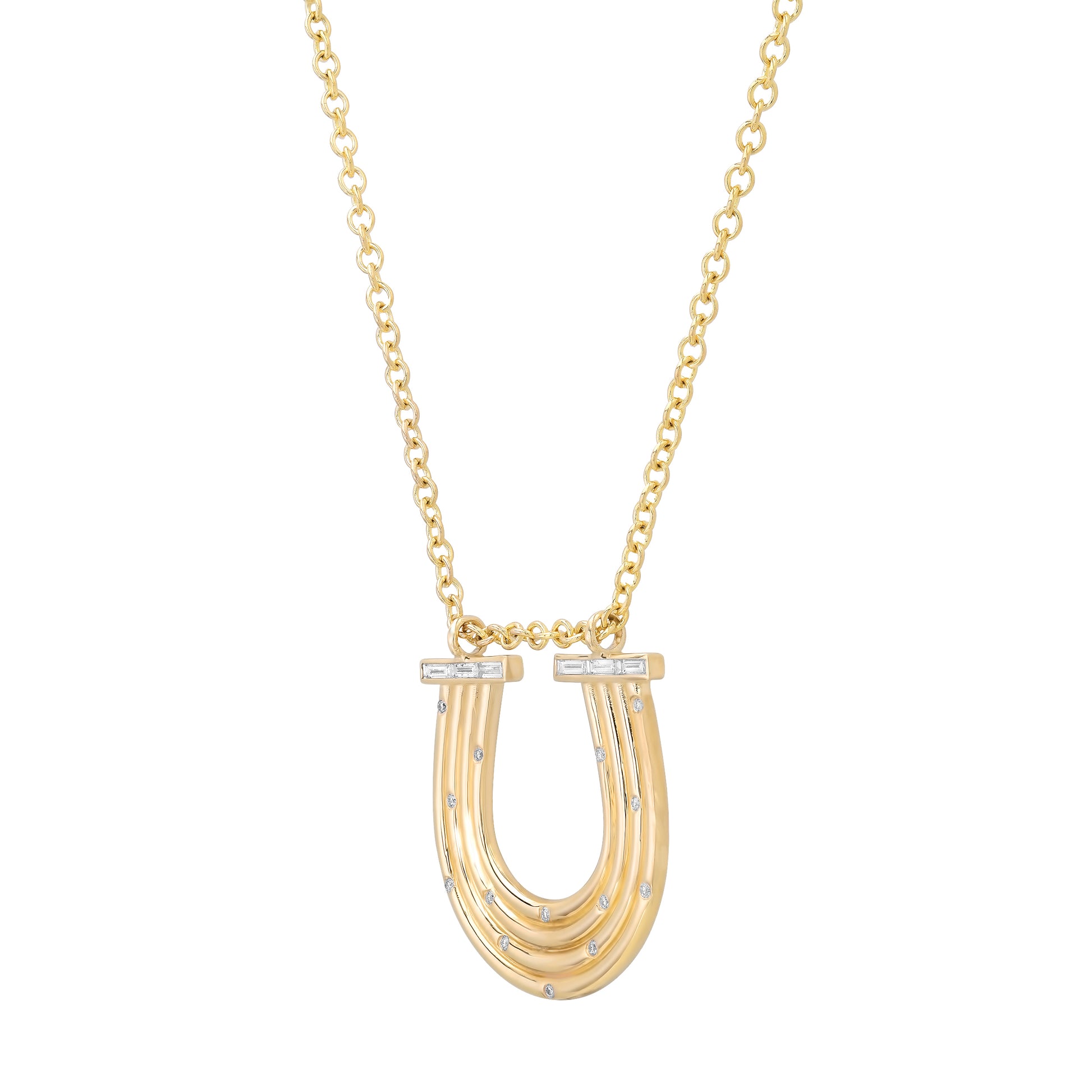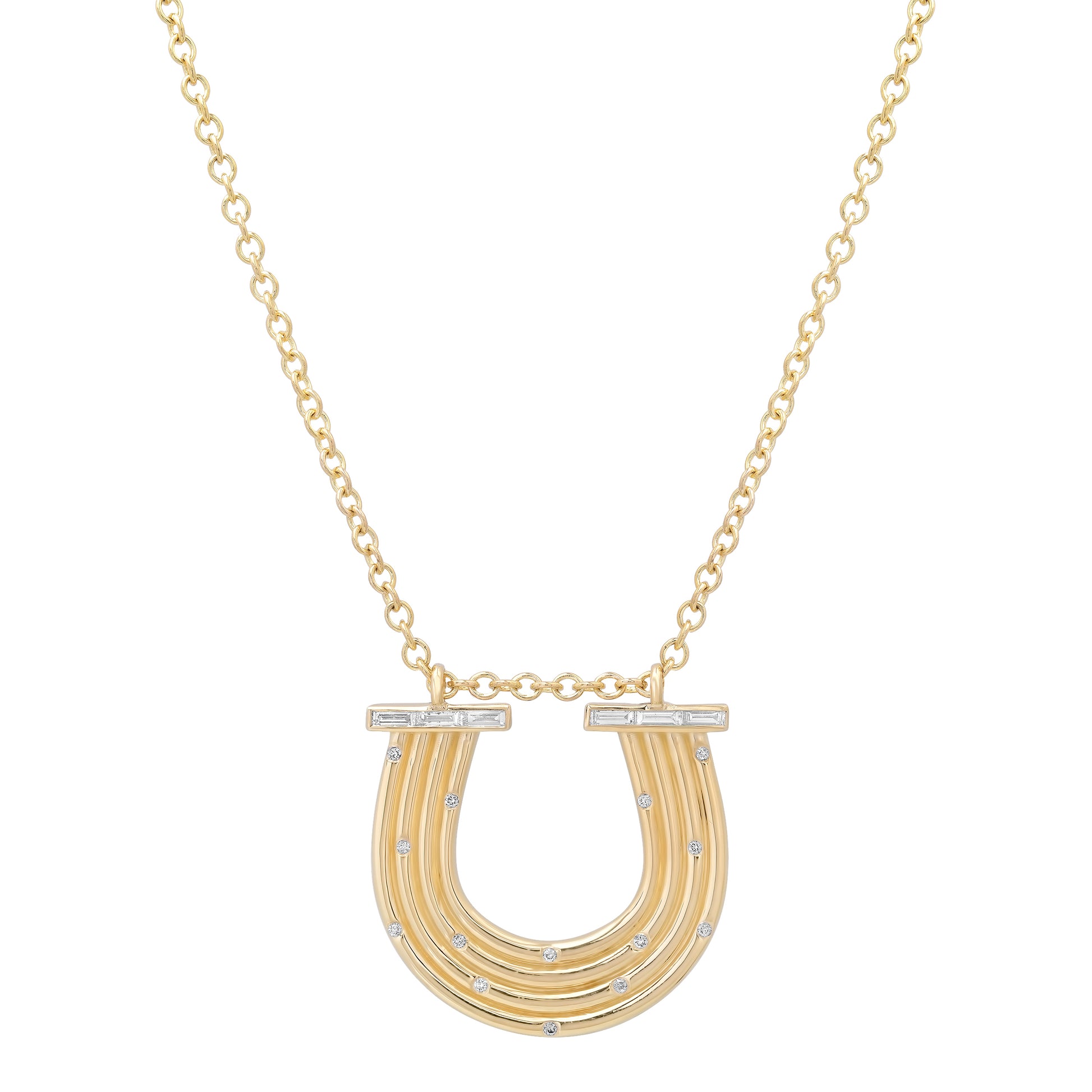 14K YG Large Slim Reeded Baguette Diamond Horseshoe Necklace