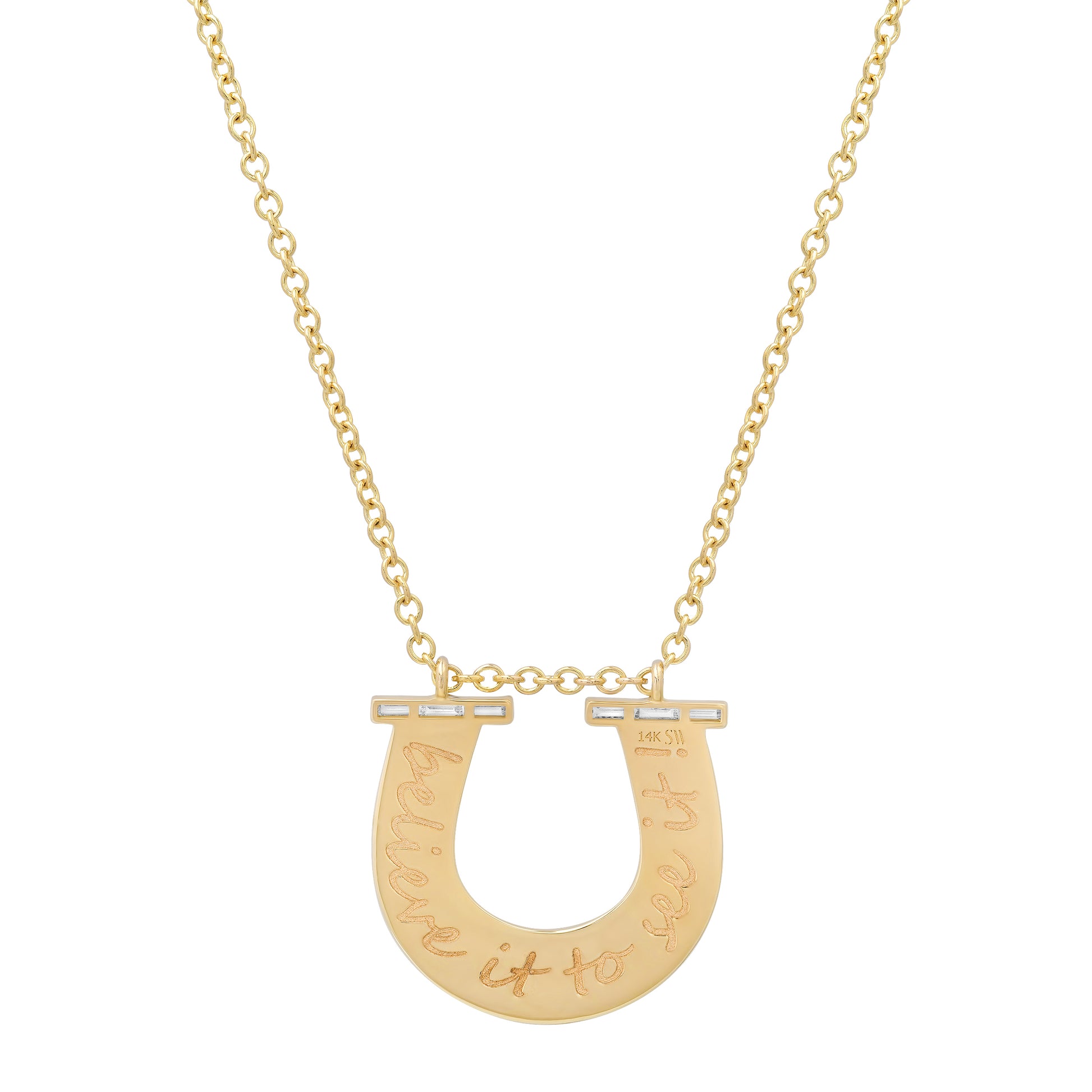 The art of manifesting is about believing without seeing. Knowing in full faith that the outcome is possible without seeing any evidence in the present. Jump knowing the parachute will open, close your eyes having full trust in yourself. The newest Horseshoe to our collection, is accented by our signature reeded gold, 6 natural white baguette Diamonds, totalling .31 carats, and suspended on a medium weight 18" rollo chain. To gild the Lily, we have engarved the back with our motto, "Believe it to see it!" Horseshoe measures 1.25" wide 1" high.