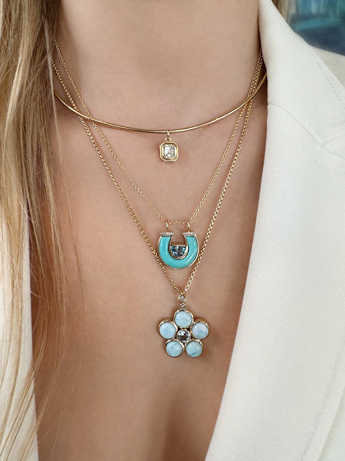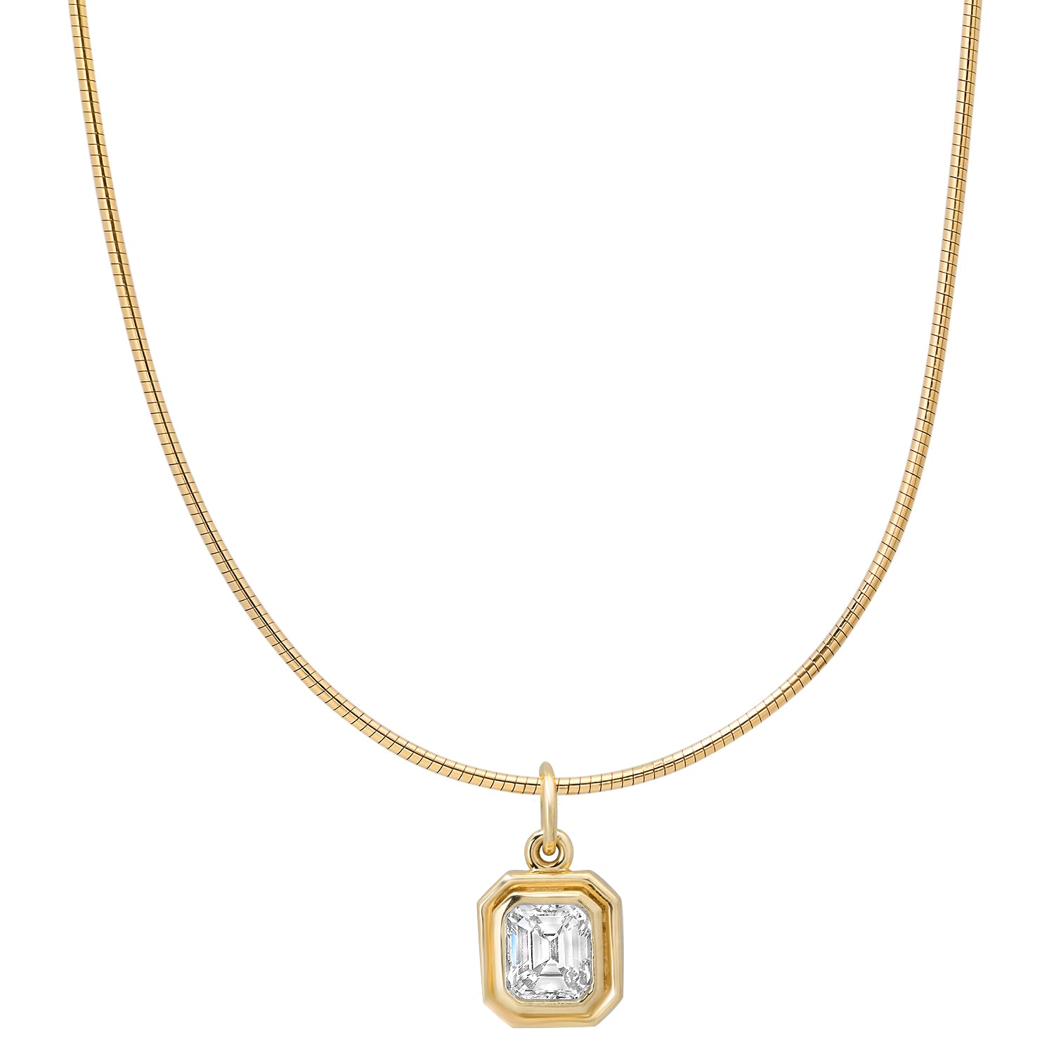 A modern twist on a solitaire necklace. Our Omega Diamond Collar boasts a gorgeous white, natural 1.0 total carat natural Asscher cut Diamond. Bezel set in a polished gold bezel, and suspended from a flexible 16" Omega chain. Perfect for layering with all your other SWJ pendants. Diamond is G color and VS1 clarity.