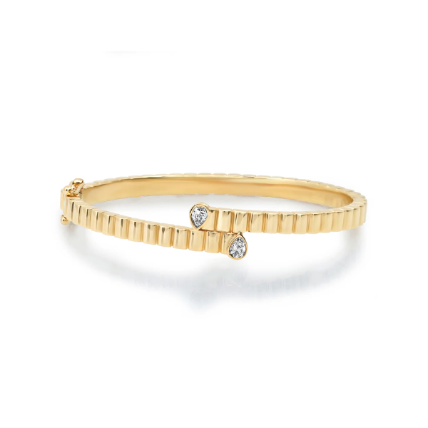 Our new gorgeous Aura Diamond Bangle will be your favorite piece of jewelry. Gilded with our Reeded Gold detail and donning 2 Pear shaped Diamonds totaling .39 tcd. A perfect layering addition to your daily wrist stack. Sized at 16" but can be customized.