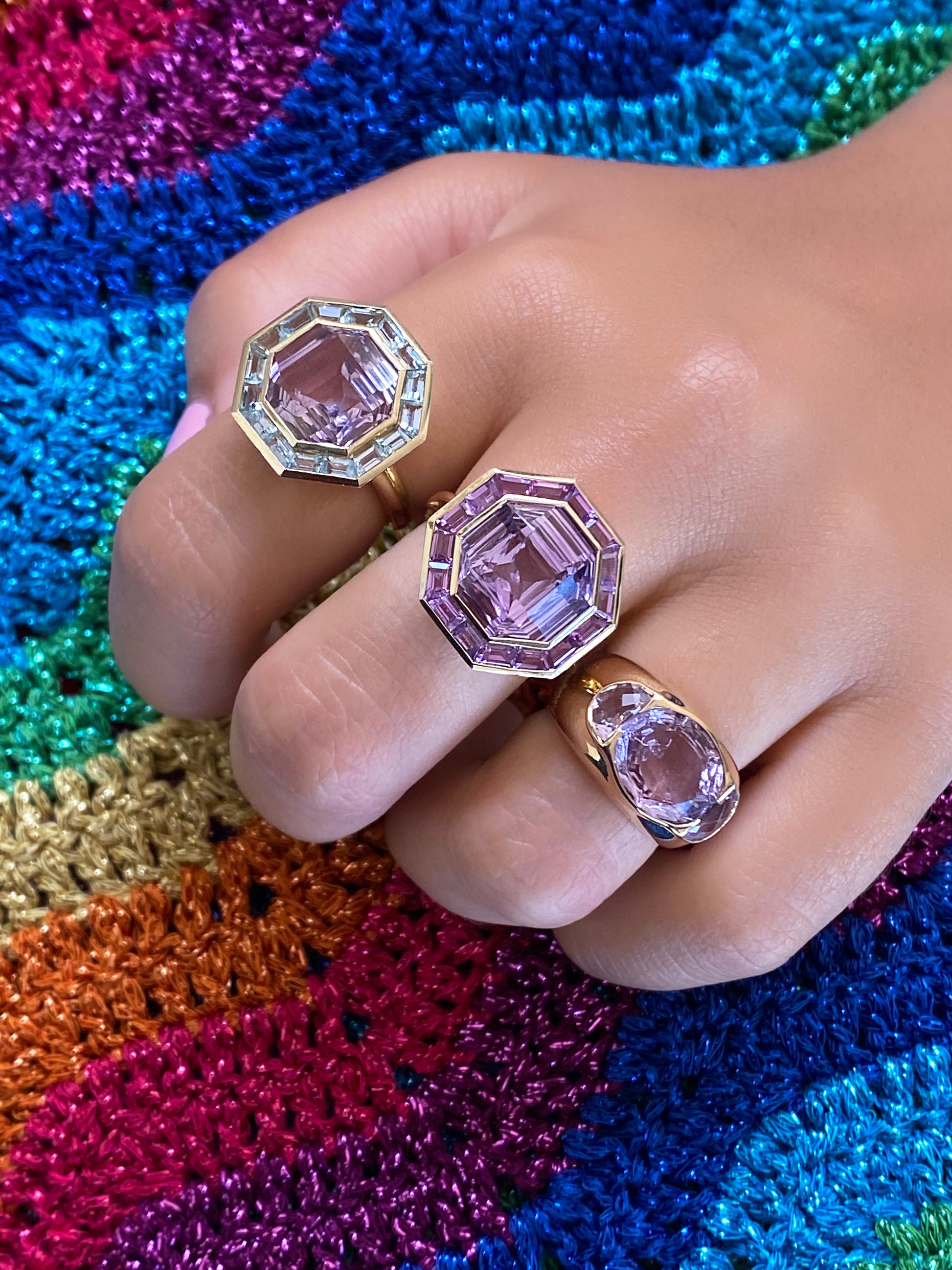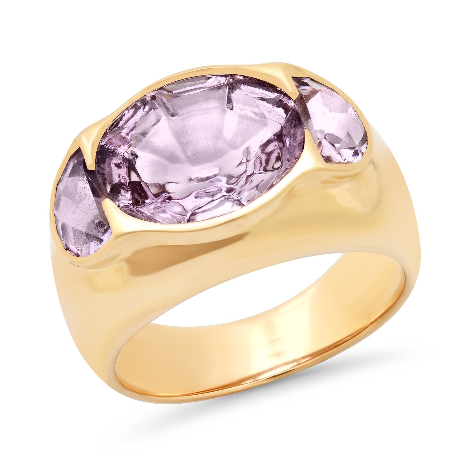 Gypsy ring revamped in this gorgeous triptych Rose de France Amethyst ring. A dreamy faceted oval shaped Lavender hued Amethyst flanked by two D shaped half oval Amethyst and set in 7 grams of 14K yellow gold. 8 carats of Amethyst total.