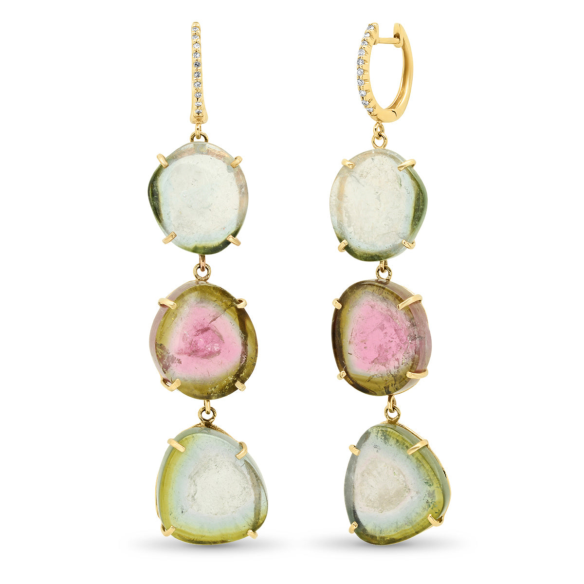 Lightweight and yet substantial, these gorgeous drop earrings earrings sparkle with 2 carats of Watermelon Tourmaline slices , set in 14K yellow gold and .30 tcd.
