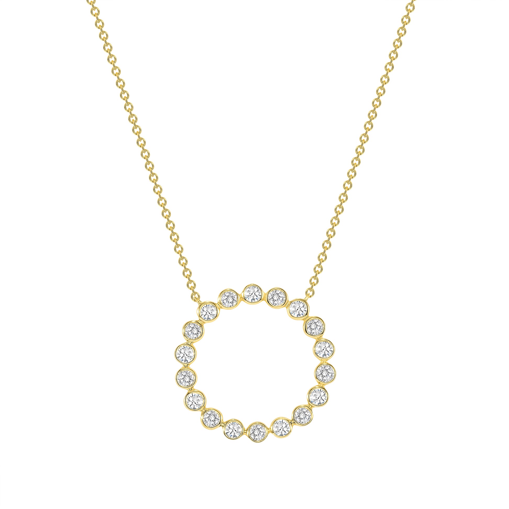 Perfect for any occasion, the Blossom diamond necklace makes a statement. 18 Bezel set diamonds set in 14K yellow gold. .49 tc diamonds on an adjustable 18" necklace.