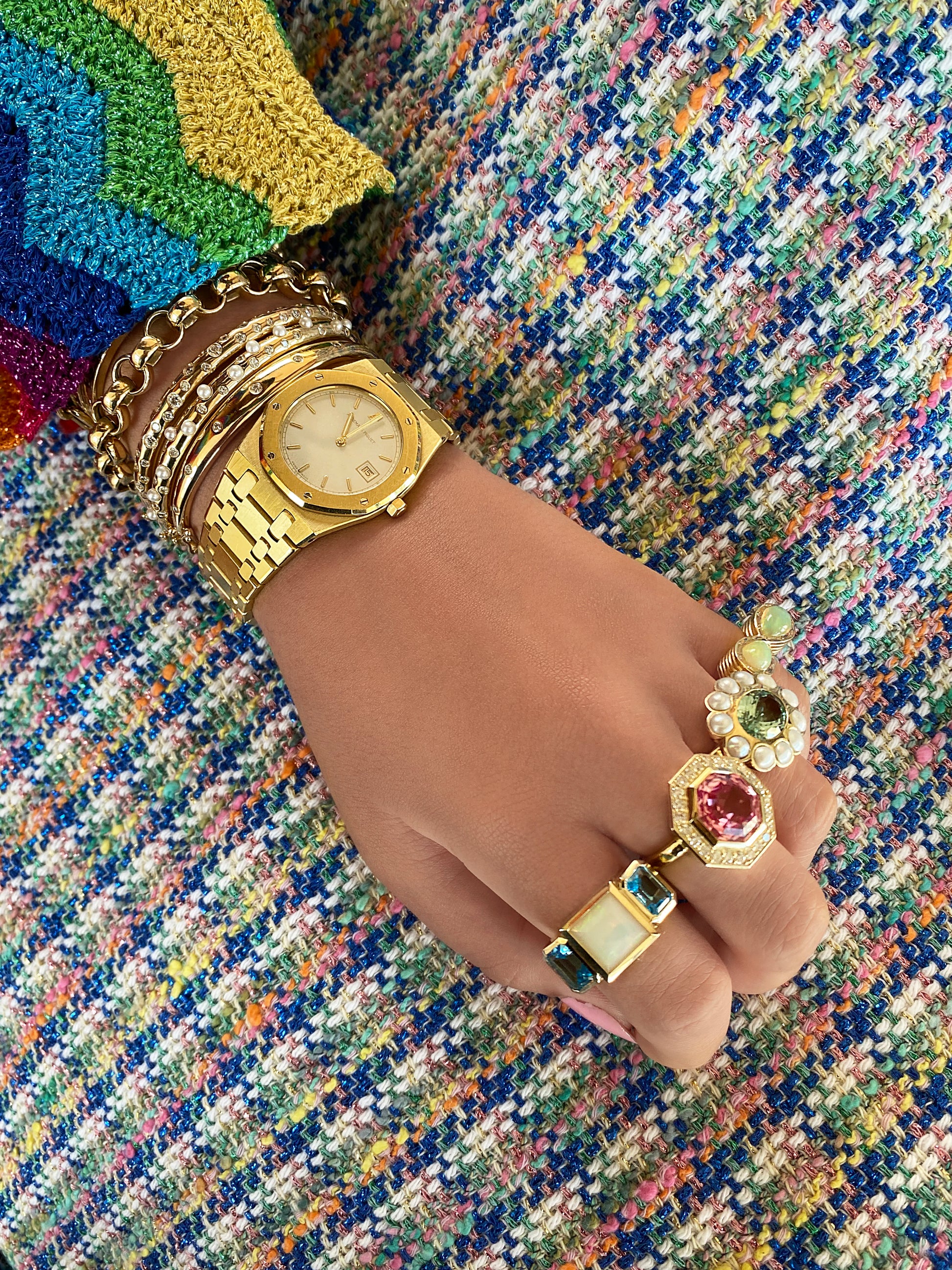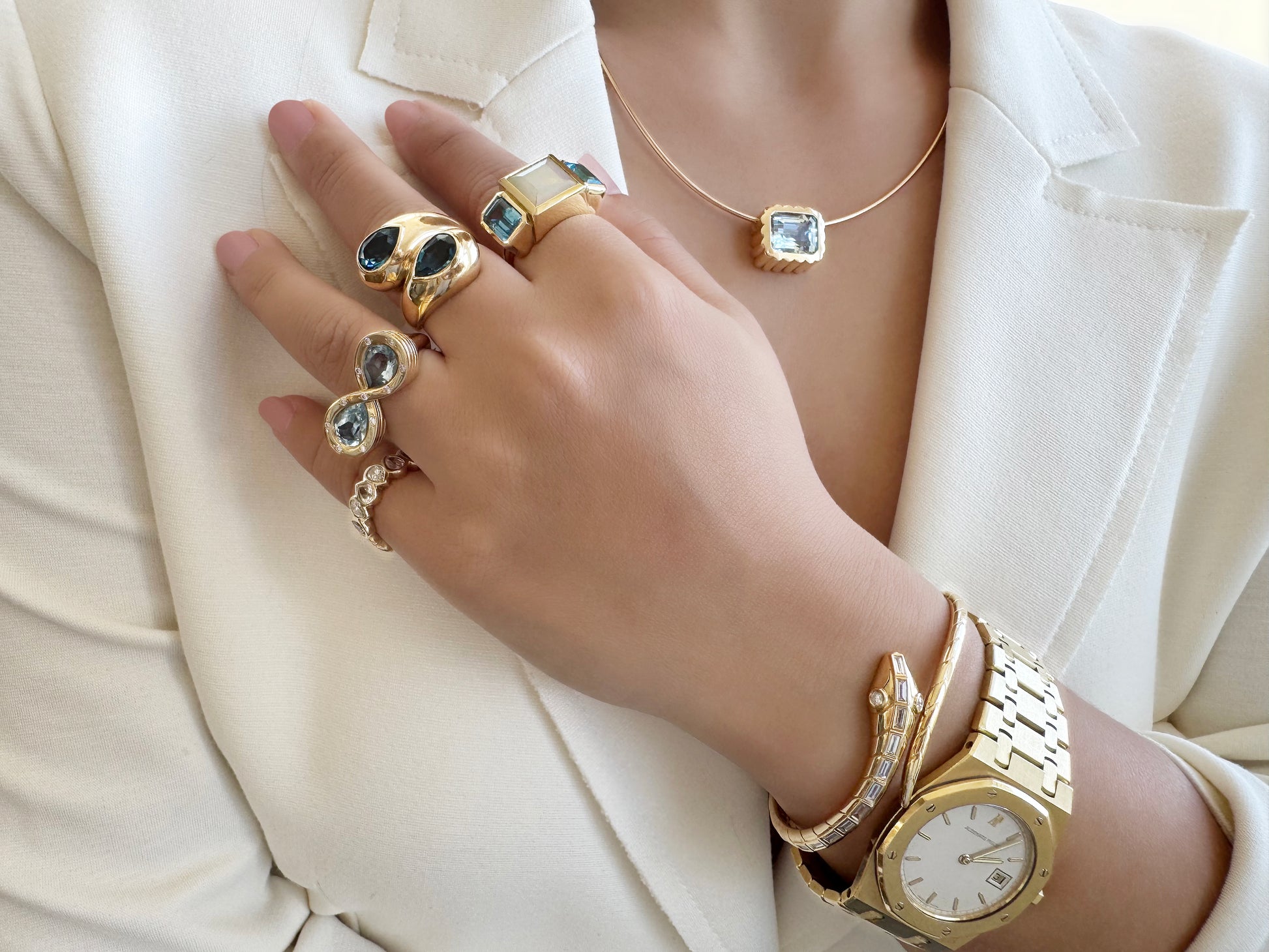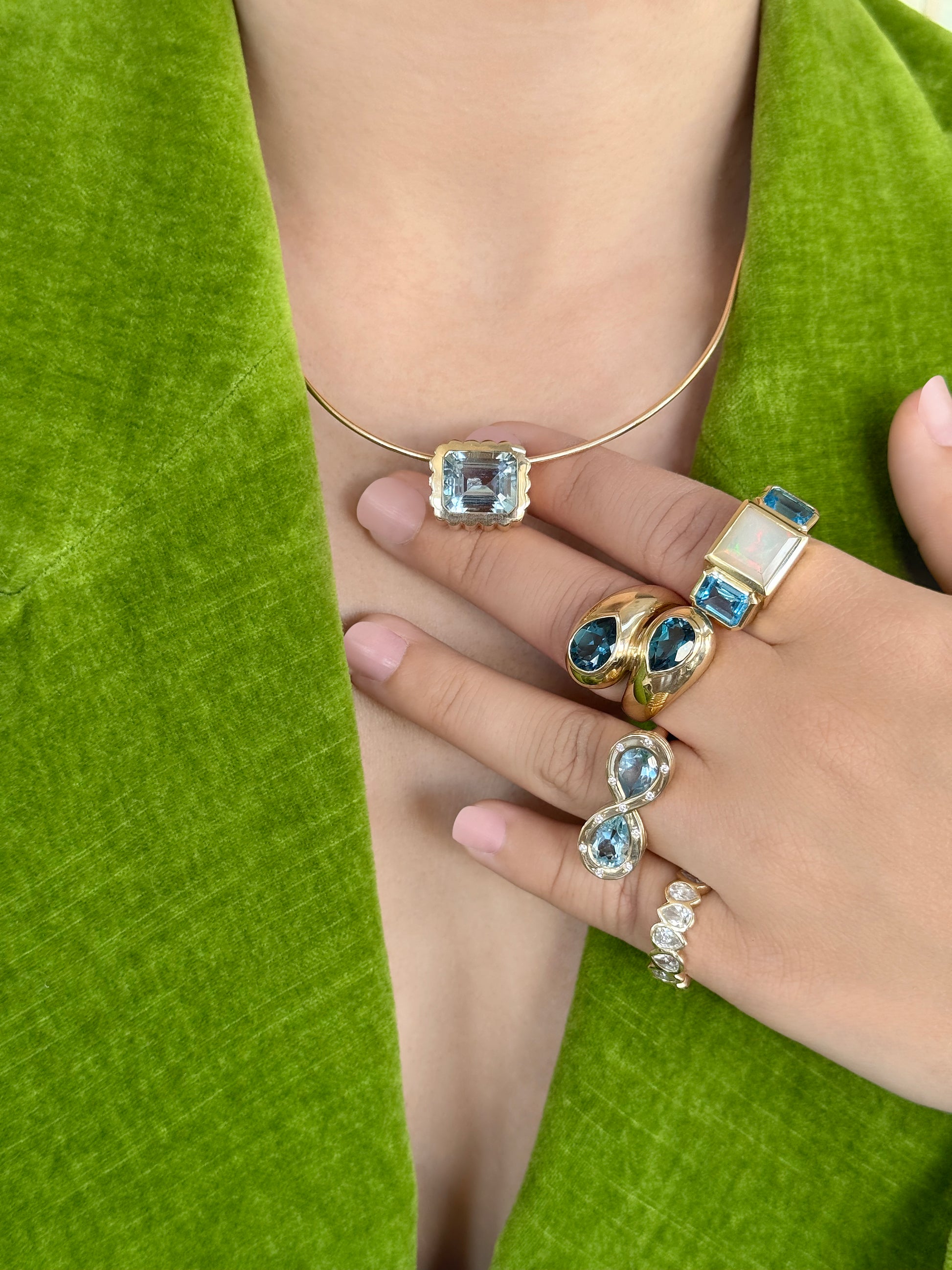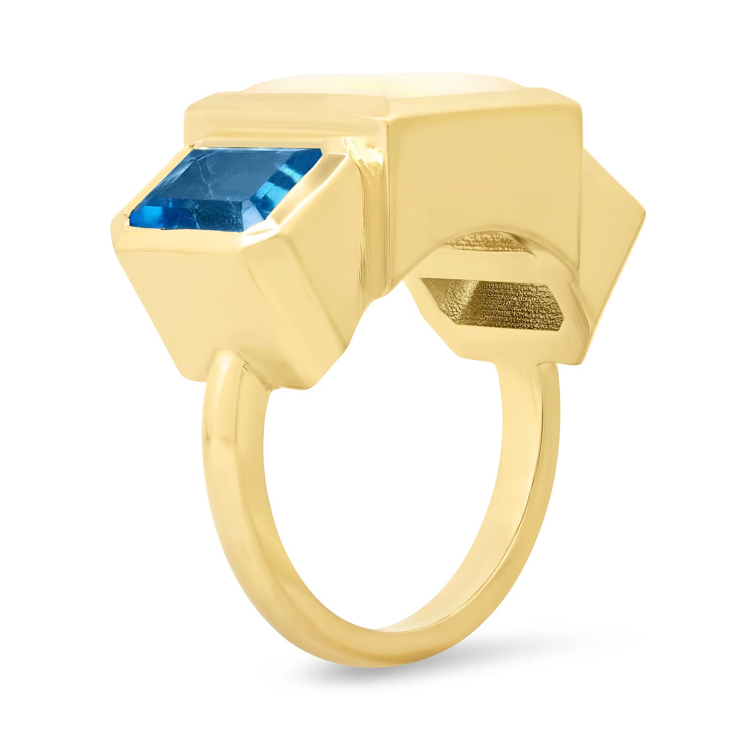 Our new gorgeous Trilogy ring, is our answer to the everyday cocktail ring. Geometric by design and perfect for every day, every occasion and with any outfit. She boasts 3 carats of mesmerizing Ethiopian Opal, flanked by two emerald cut Blue Topaz.
