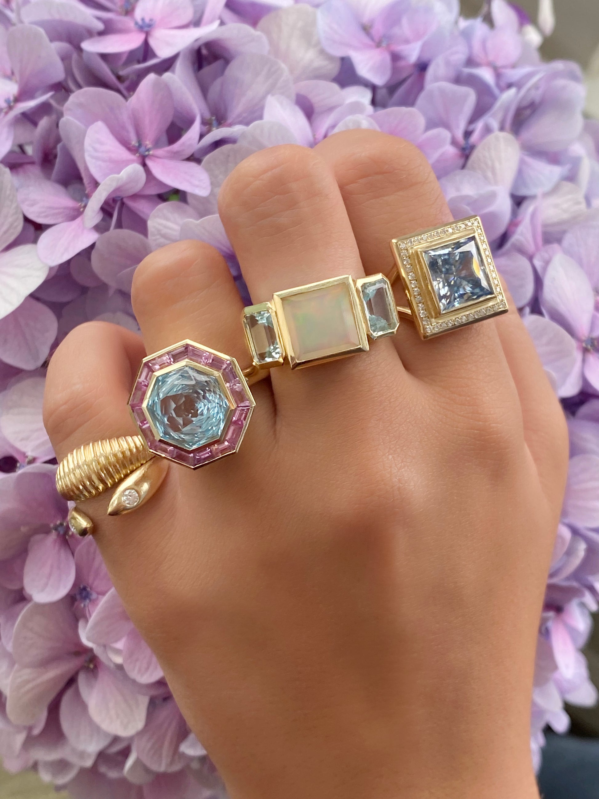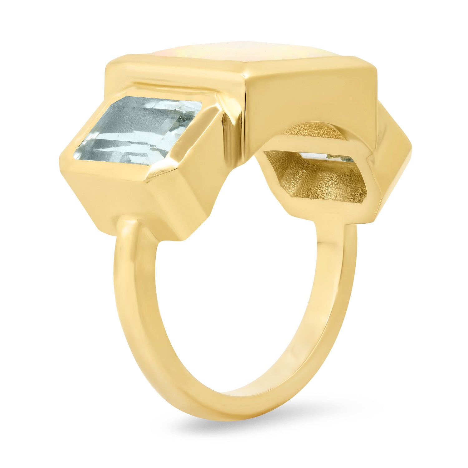 Our new gorgeous Trilogy ring, is our answer to the everyday cocktail ring. Geometric by design and perfect for every day, every occasion and with any outfit. She boasts 3 carats of mesmerizing Ethiopian Opal, flanked by two emerald cut Aquamarine.
